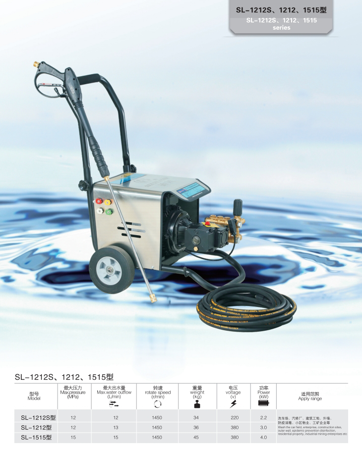 上海神龍集團生產的高壓清洗機SL-1212S、1212、1515型高壓清洗機,適用洗車場、汽修廠、建筑工地、外墻、防疫消毒、小區物業、工礦企業等。