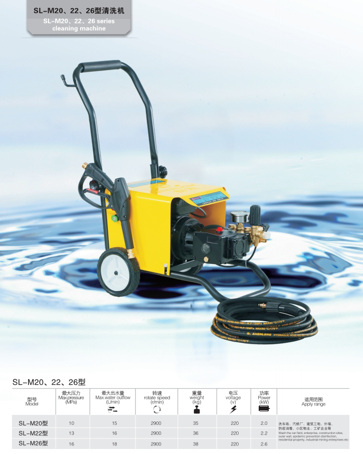 上海神龍集團生產(chǎn)的高壓清洗機SL-M20、22、26型高壓清洗機,適用洗車場、汽修廠、建筑工地、外墻、防疫消毒、小區(qū)物業(yè)、工礦企業(yè)等。