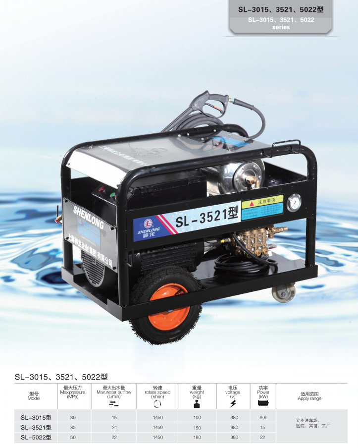 上海神龍集團生產的高壓清洗機SL-3015、3521、5022型清洗機,適用洗車場、汽修廠、建筑工地、外墻、防疫消毒、小區物業、工礦企業等。